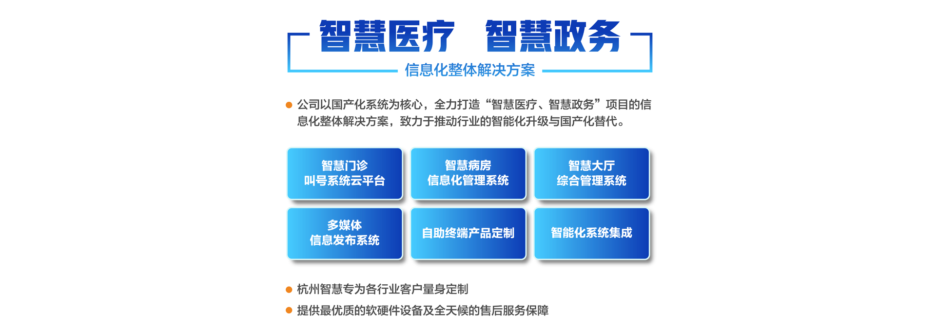 杭州智慧科技有限公司初創(chuàng)于2003年,總部位于重要的電子商務(wù)中心中國(guó)杭州公司主營(yíng)業(yè)務(wù)有:智慧分診叫號(hào)系統(tǒng)、智慧病房醫(yī)護(hù)對(duì)講系統(tǒng)、智慧大廳綜合管理系統(tǒng)、智慧政務(wù)管理系統(tǒng)、智慧多媒體信息發(fā)布系統(tǒng)、導(dǎo)診系統(tǒng)及各自助終端產(chǎn)品定制。專(zhuān)為各行業(yè)客戶(hù)量身定制。公司已有20余年行業(yè)經(jīng)驗(yàn)沉淀積累,擁有優(yōu)秀的產(chǎn)品外觀(guān)設(shè)計(jì)師和各類(lèi)中高級(jí)專(zhuān)業(yè)技術(shù)工程師,確保所研發(fā)的產(chǎn)品具有行業(yè)領(lǐng)先的外觀(guān)及可靠的技術(shù)性能。并擁有權(quán)威部門(mén)頒發(fā)的各類(lèi)知識(shí)產(chǎn)權(quán)及專(zhuān)利證書(shū),30多項(xiàng)資質(zhì)證書(shū)、800多個(gè)合作伙伴、2000多個(gè)項(xiàng)目成功案例經(jīng)驗(yàn)。 智慧產(chǎn)品已遍及全國(guó)各醫(yī)療、政務(wù)、金融、通訊、公安、工商、稅務(wù)等行業(yè),形成以“立足杭州、輻射長(zhǎng)三角、拓展全國(guó)”的戰(zhàn)略發(fā)展格局,產(chǎn)品經(jīng)過(guò)歷年不斷創(chuàng)新,形成專(zhuān)業(yè)化、平臺(tái)化,致力于成為智慧產(chǎn)品的領(lǐng)軍企業(yè)。 公司建立了完善的技術(shù)培訓(xùn)及售后服務(wù)中心,并設(shè)24小時(shí)熱線(xiàn)咨詢(xún)電話(huà)解答用戶(hù)反饋的問(wèn)題。同時(shí)應(yīng)客戶(hù)要求定期派技術(shù)人員到 全國(guó)各地進(jìn)行技術(shù)指導(dǎo)輔助用戶(hù)正確使用智慧產(chǎn)品并能獨(dú)立安裝、調(diào)試、日常維護(hù)等工作。提供最優(yōu)質(zhì)的設(shè)備及全天候的售后服務(wù)保障,智慧永恒不變的服務(wù)宗旨——致力于客戶(hù)的滿(mǎn)意與成功!...